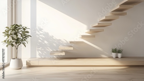 Modern interior featuring a stylish wooden staircase, ample natural light, and minimalistic decor for an elegant atmosphere.