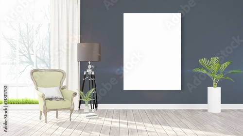 Modern interior with empty frame . 3D rendering