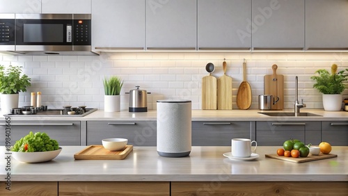 Modern kitchen counter with a sleek smart home speaker displaying a blank screen, surrounded by utensils and appliances, ample copy space for text or design overlays.