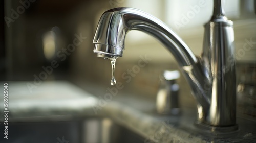 Modern kitchen faucet with a single drop of water hanging from the spout, showcasing sleek design and functionality in a contemporary home environment