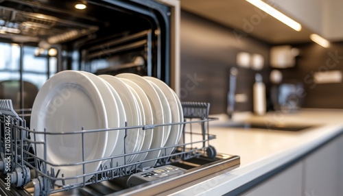 Modern kitchen featuring white dishes ready for cleaning in an electronic dishwasher appliance