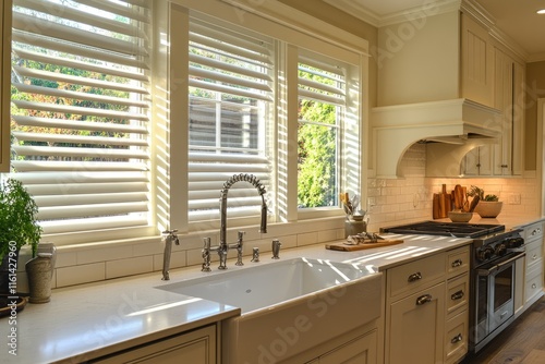 Modern Kitchen Interior Featuring Elegant White Window Blinds Above a Stylish Countertop and Sink