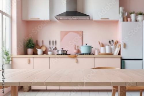 Modern kitchen interior featuring stylish furniture and a sleek design with pastel wooden elements and glass accents in a light-filled room