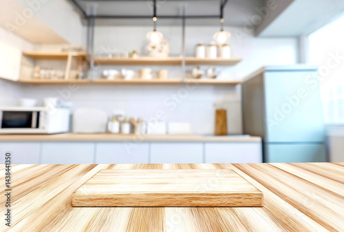 Modern kitchen interior with wooden countertop displaying minimalist design and bright natural light ambiance : Generative AI