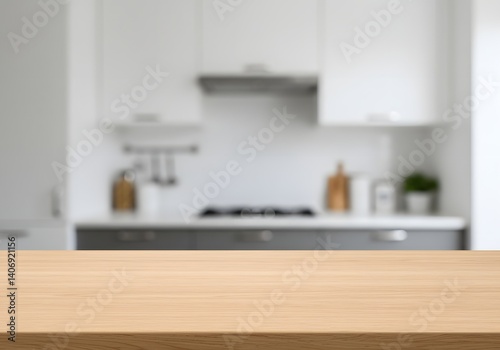 Modern Kitchen Interior with Wooden Tabletop for Product Display, Blurred Background - Appliances, Decor.