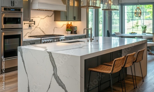 Modern kitchen with a sleek marble island, stainless steel appliances, and stylish lighting, representing elegance and functionality.