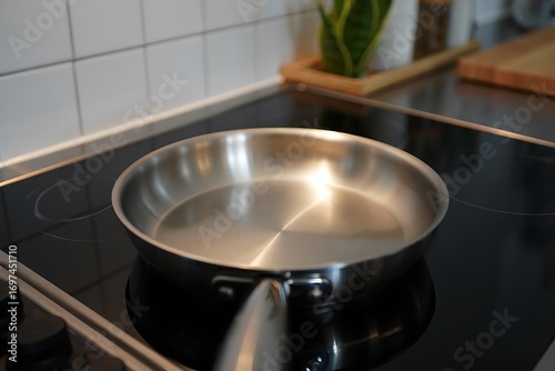 Modern kitchen with frying pan on black induction stovetop. Prepare delicious healthy meals at home using essential cookware and utensils. Stylish interior with wooden countertop and white tile backsp