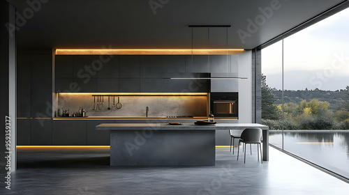 Modern kitchen with grey cabinets, a large island, and a view of a pool and forest through a window.