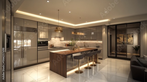 Modern Kitchen with Island, Sleek Cabinets, and Golden Accents