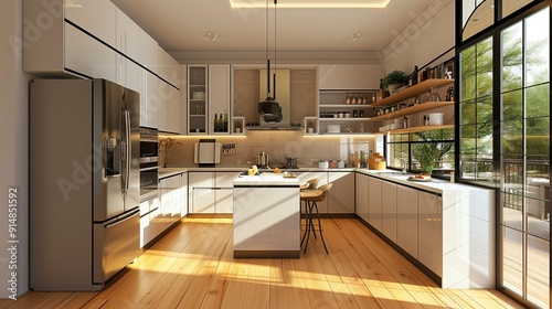 Modern Kitchen With White Cabinets And Island In A Sunny Home
