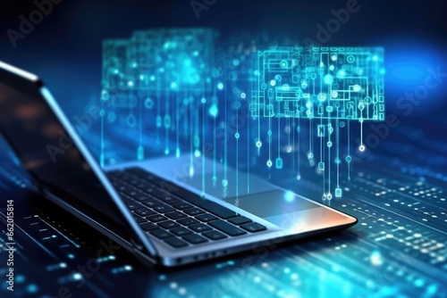 Modern laptop caught in the swirling vortex of data nanotechnology and artificial intelligence