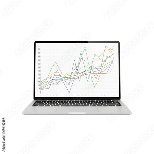 Modern laptop displaying complex stock market candlestick chart analysis financial data visualization transparent background