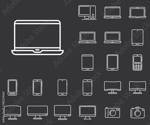 Modern laptop icon in set on the black background. Set of thin, linear and modern electronic equipment icons. Universal linear icons to use in web and mobile app.