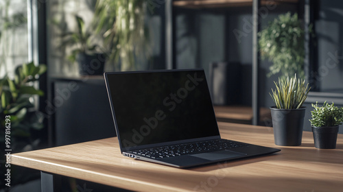 modern laptop on a wooden desk with greenery in a minimalist office setting