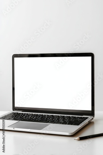 Modern laptop with blank screen. Minimalist workspace. Ideal for website banners, social media posts, and presentations.