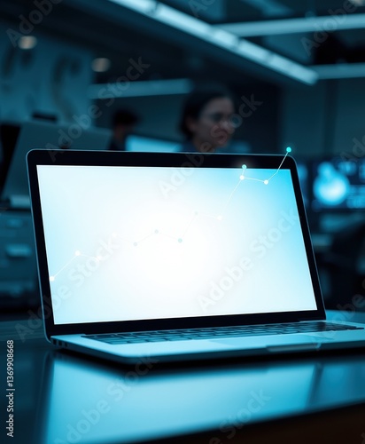 Modern Laptop with Blue Financial Analytics Graph in Corporate Setting, Professional Business Intelligence Photography for Financial Technology Marketing and Data Analysis Services