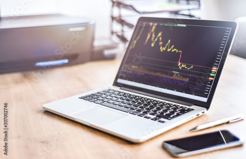Modern laptop with financial bitcoin cryptocurrency crypto graph data trade. Computer notebook workplace detail.