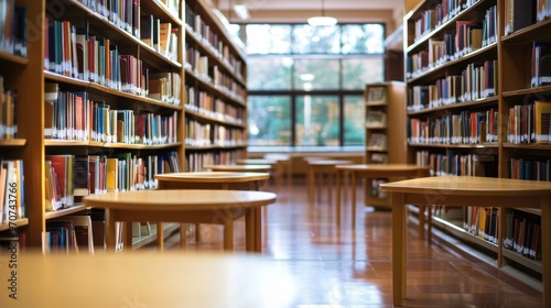 Modern library or bookstore interior with Learning and coworking space,relax zone,Library with rows of bookshelves arranged,school,university,shared desk and chairs,panoramic window.