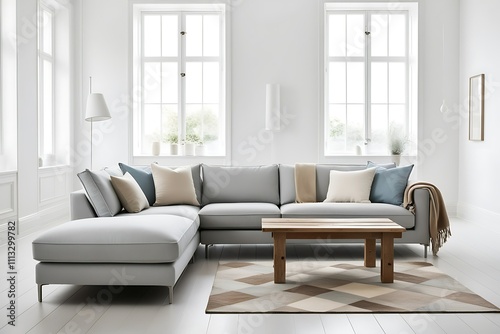 Modern light grey sectional sofa in bright living room with wooden coffee table and patterned rug.