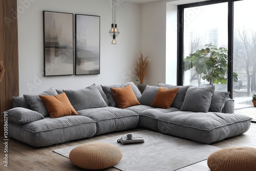 Modern light grey wavy corduroy L-shaped corner sofa with chaise lounge in a minimalistic white room. Cozy texture and contemporary elegance.