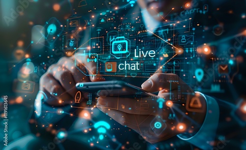 Modern live chat concept with hands using mobile device surrounded by glowing digital icons and symbols. Perfect for customer service and online communication designs.