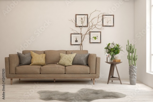 Modern living room in white color with sofa. Scandinavian interior design. 3D illustration