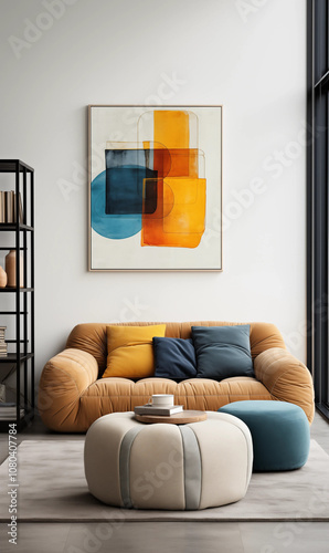 Modern Living Room Interior Design with Yellow Sofa Abstract Painting and Round Ottomans