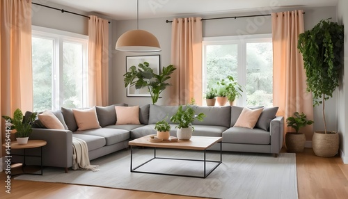 Modern Living Room Interior with Gray Sectional Sofa and Peach Curtains