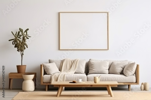 Modern living room interior with white sofa, coffee table and mock up poster frame.