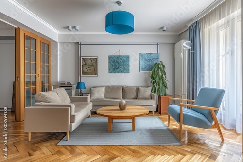 Modern living room setup with classic parquet floor. Furnished with light gray sofa, blue arm chair with wooden frame, modern blue ceiling lamp, wooden coffee table and gray carpet.
