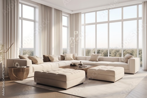 Modern living room, white furniture, floor-to-ceiling window, in the style of realistic and hyper-detailed renderings, light bronze and beige, panoramic scale, minimalist staging