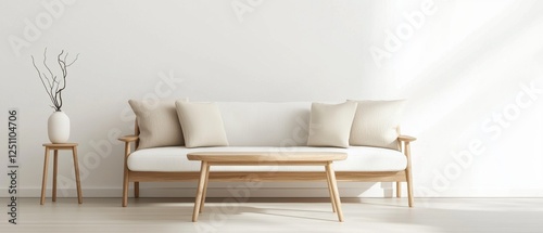 Modern living room with a white sofa and a wooden coffee table in the center. the sofa is upholstered in a light beige fabric and has three beige throw pillows on it.