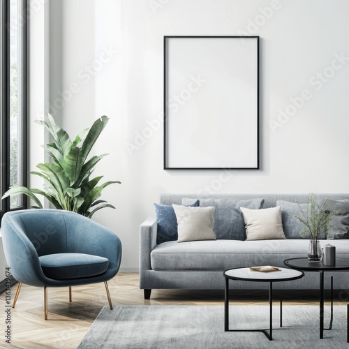 Modern living room with gray sofa, blue armchair, and empty frame.