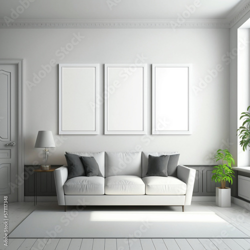 Modern living room with mock up poster frames, Contemporary style, 3D render, 3D illustration
