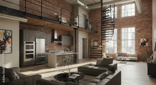 Modern Loft Apartment Interior Design with Brick Walls and Spiral Staircase