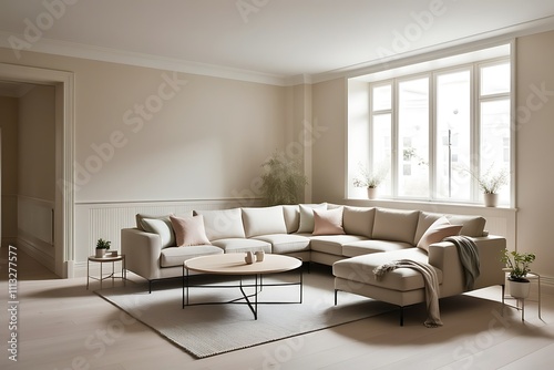 Modern L-shaped beige sofa in a bright living room with large windows and wooden floor.