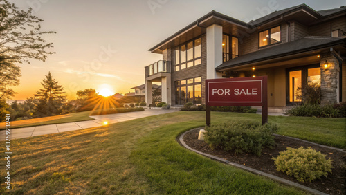 modern luxurious house with for sale sign, showcasing beautiful sunset in background. property features well maintained lawn and elegant architecture, creating inviting atmosphere