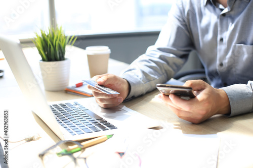 Modern man using credit card and mobile phone for online payment. Mobile shopping concept.