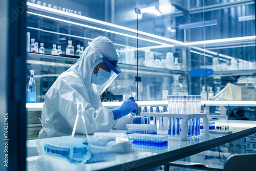 Modern medical research laboratory with a person in a mask and white suit and test tubes with biochemicals on the desk. Scientific Laboratory of the Hi-Tech Biotechnology