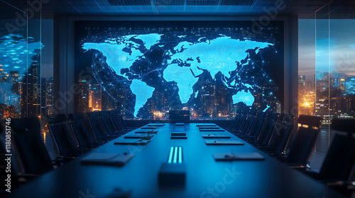 modern meeting room with large digital world map display, surrounded by sleek chairs and cityscape view, creates futuristic and professional atmosphere