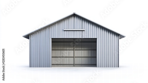 Modern Metal Shed: A detailed view of a modern, metallic shed. This practical structure has a classic gable roof, open doorway and siding, showcasing its durable design.