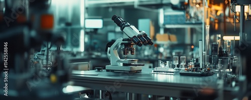 Modern microscope stands on a table in a sterile high-tech laboratory or research facility