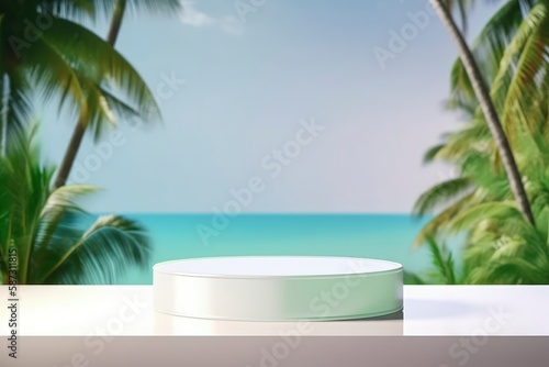 Modern minimal product display. Empty white round podium for product showcase on blur tropical beach background made with Generative AI