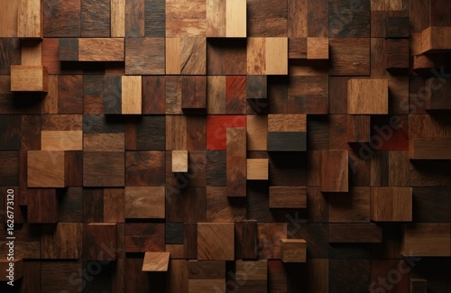 Modern minimal wall decoration featuring brown square wood block mosaic with varied textures, shades. Geometric pattern of wooden cubes creates three-dimensional effect, ideal for interior design