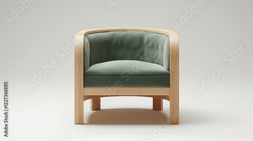 Modern minimalist armchair with a light wooden frame and soft green upholstery in a neutral setting
