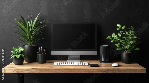 Modern Minimalist Home Office Setup with Computer, Green Plants, and Stylish Accessories on a Wooden Desk Against a Dark Textured Wall Background