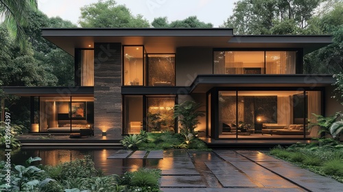 Modern Minimalist House Design Surrounded by Lush Greenery with Reflective Wet Pavement at Twilight