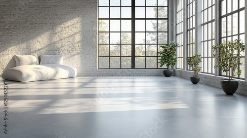 Modern minimalist interior with large windows, soft cushions, and potted plants in bright light