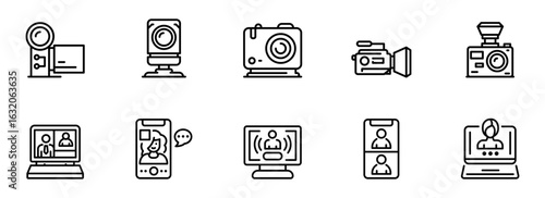 Modern Minimalist Line Icons: Video Conferencing, Webcam, Camera, and Recording Equipment for Digital Communication and Online Meetings.