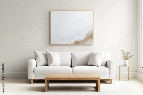 Modern minimalist living room featuring a cozy white sofa with soft cushions, a decorative coffee table, and a serene abstract art piece on the wall.